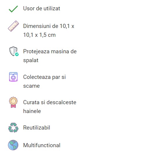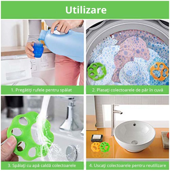 Aceasta capcana pentru par, care se foloseste in timpul unui ciclu de spalare, prinde toate impuritatile care se afla in masina de spalat, precum scame, par de animale, fire de par si multe altele.Fabricat din material foarte moale, lipicios si flexibil care prinde parul de animale de pe haine.Indeparteaza parul de animale direct dar mai ales in masina de spalat sau uscatorul de haine.In timpul procesului de spalare in masina de spalat acestea agata parul lasand hainele mai curate.